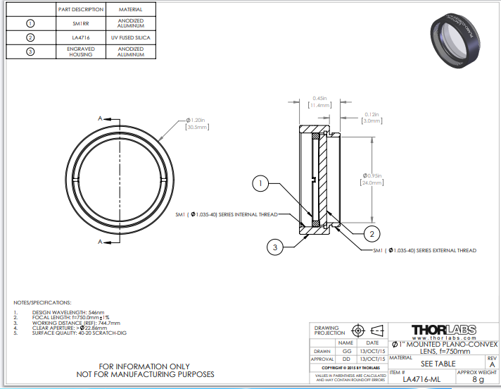 Thorlabs索雷博 LA4716-ML 平凸透镜