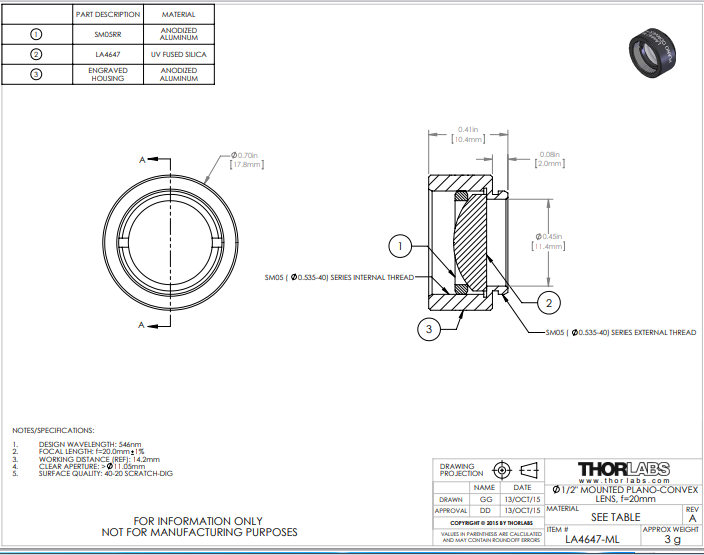 Thorlabs索雷博 LA4647-ML 平凸透镜