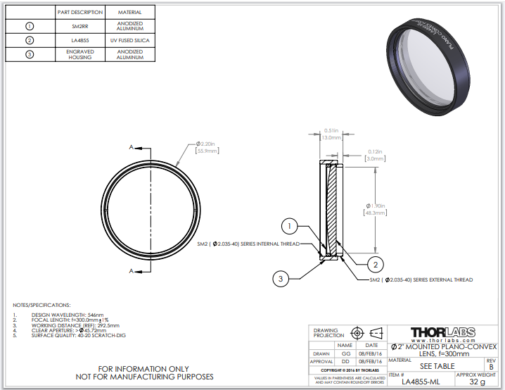 Thorlabs索雷博 LA4855-ML 平凸透镜