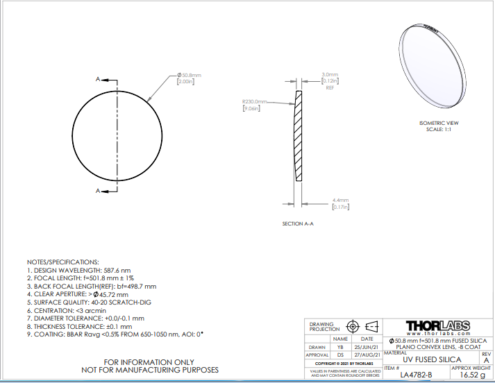 Thorlabs索雷博 LA4782-B 平凸透镜