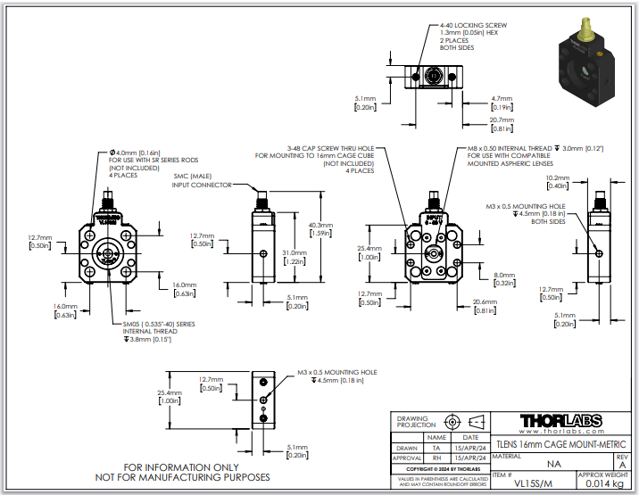 Thorlabs索雷博 VL15S/M 可调焦透镜