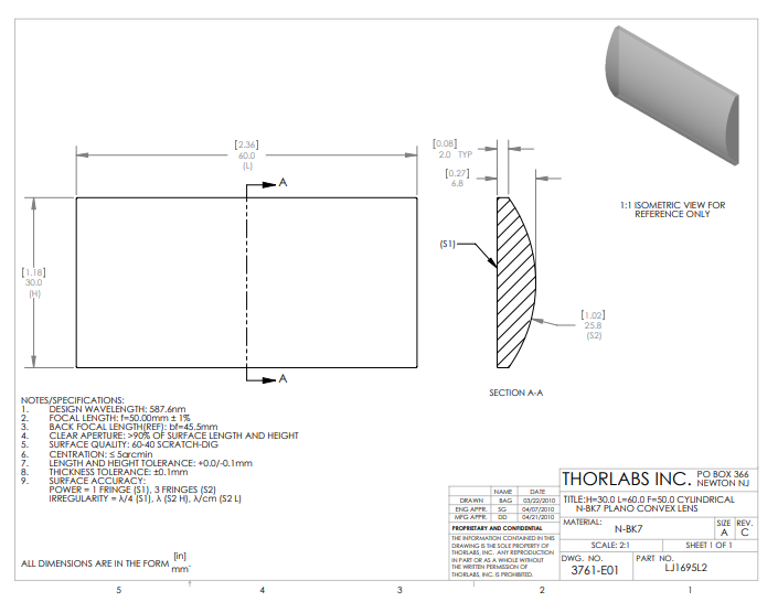 Thorlabs索雷博 LJ1695L2 平凸柱面透镜