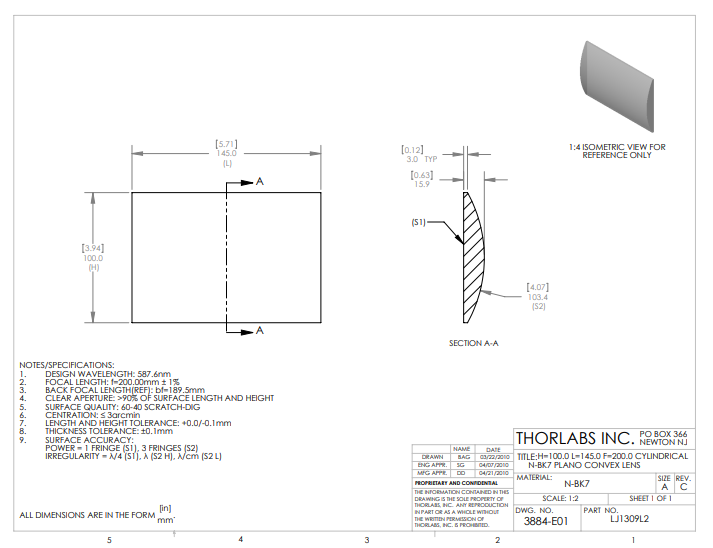 Thorlabs索雷博    LJ1309L2   平凸柱面透镜