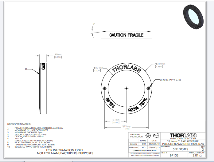 Thorlabs索雷博   BP133 - Ø1英寸薄膜分束器