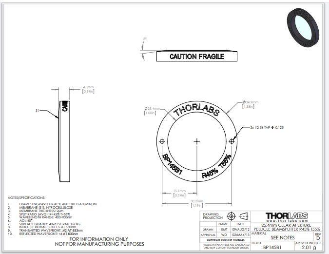 Thorlabs索雷博 BP145B1 - Ø1英寸薄膜分束器