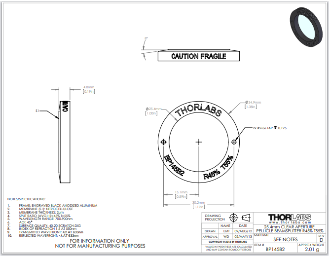Thorlabs索雷博 BP145B2 - Ø1英寸薄膜分束器