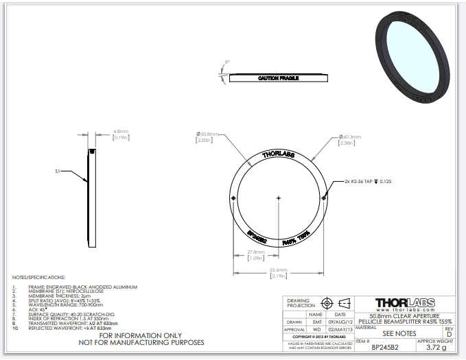 Thorlabs索雷博   BP245B2 - Ø2英寸薄膜分束器