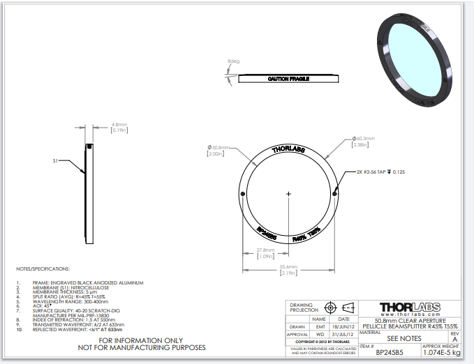 Thorlabs索雷博 BP245B5 - Ø2英寸薄膜分束器