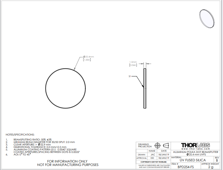 Thorlabs索雷博 BPD254-FS 波尔卡点状分束镜