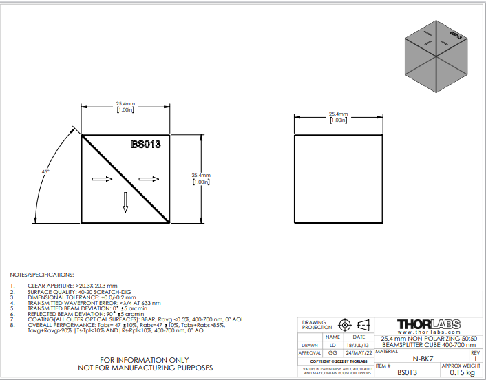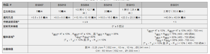 Thorlabs索雷博   BS013   50:50非偏振分束立方