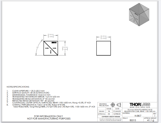 Thorlabs索雷博 BS015 - 50:50非偏振分束立方