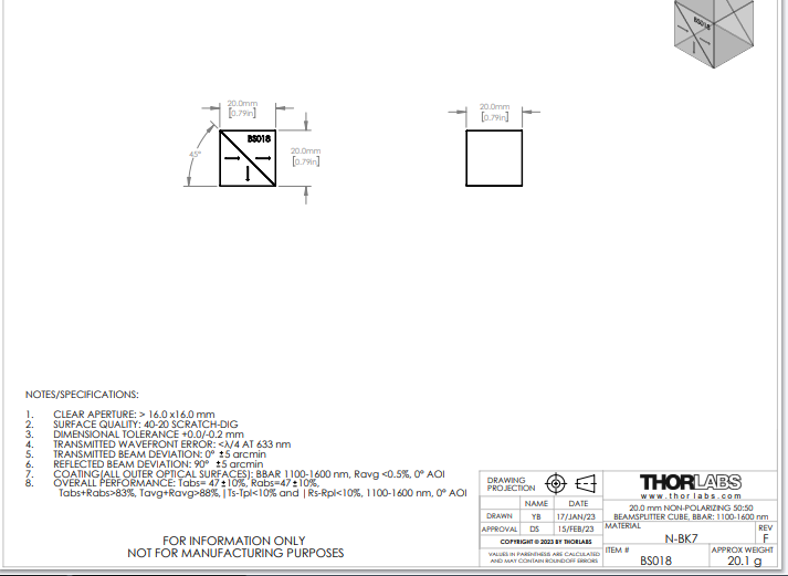 Thorlabs索雷博 BS018 - 50:50非偏振分束立方