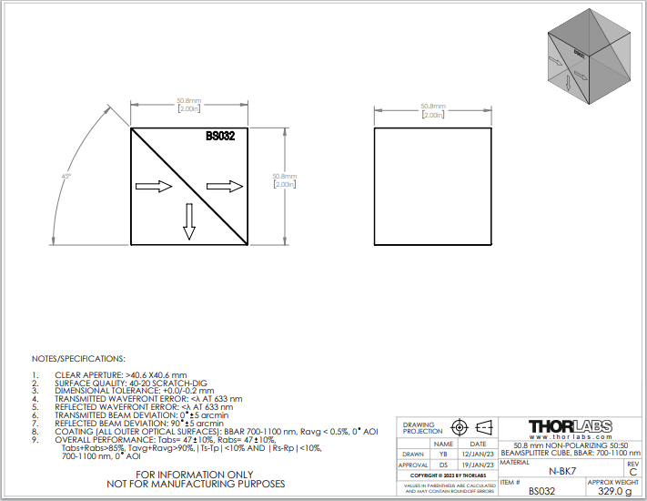 Thorlabs索雷博   BS032   50:50非偏振分束立方