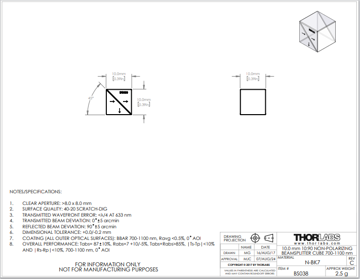 Thorlabs索雷博 BS038 10:90(R:T)非偏振分束立方