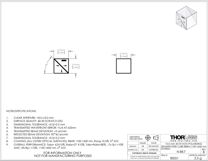 Thorlabs索雷博 BS051 30:70(R:T)非偏振分束立方