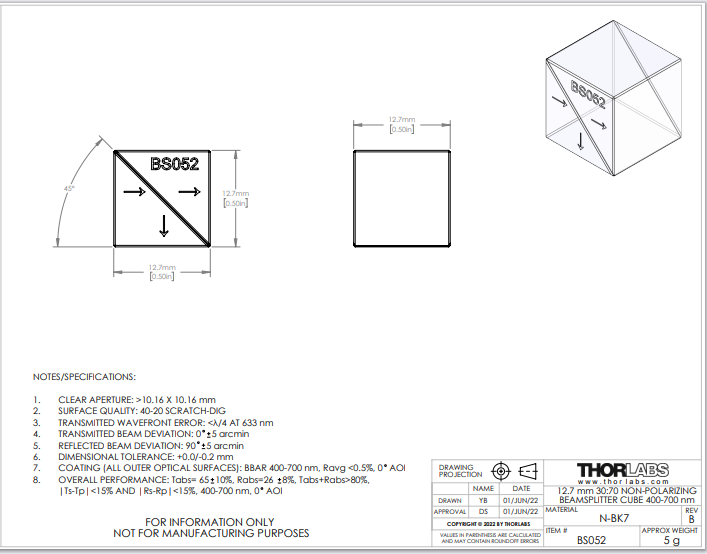 Thorlabs索雷博 BS052 30:70(R:T)非偏振分束立方