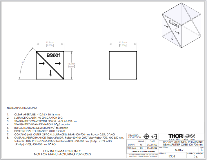 Thorlabs索雷博 BS061 70:30(R:T)非偏振分束立方