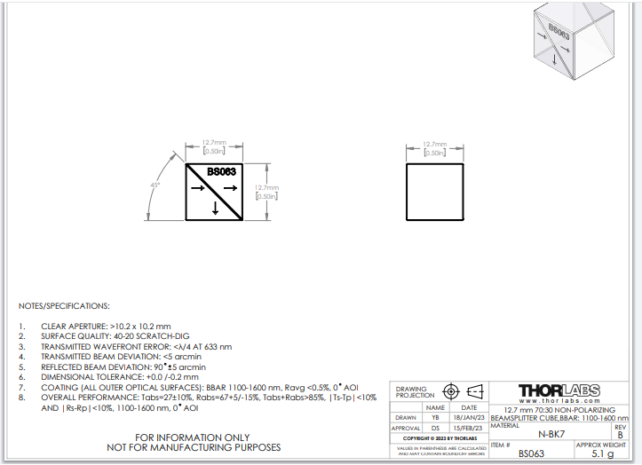 Thorlabs索雷博 BS063 - 70:30(R:T)非偏振分束立方