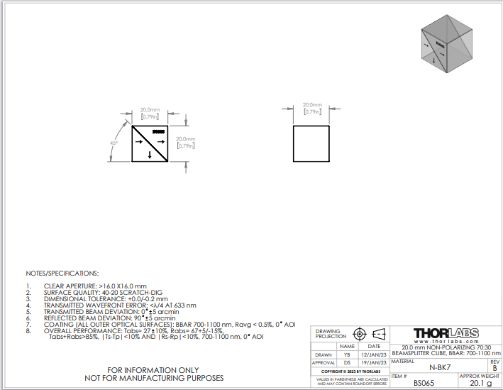 Thorlabs索雷博   BS065   70:30(R:T)非偏振分束立方