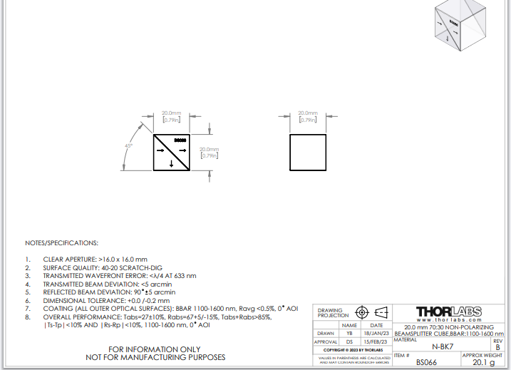 Thorlabs索雷博 BS066 - 70:30(R:T)非偏振分束立方