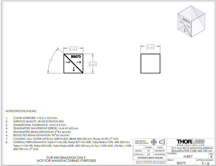 Thorlabs索雷博 BS073 90:10(R:T)非偏振分束立方