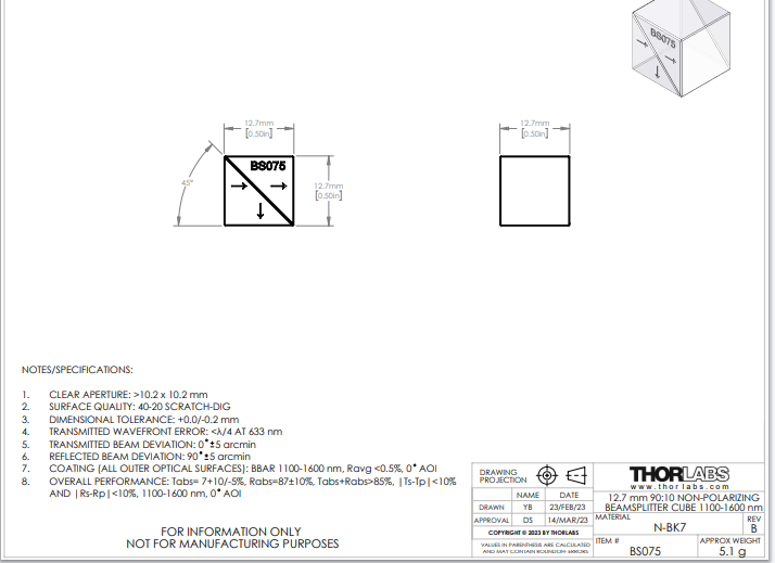 Thorlabs索雷博 BS075 - 90:10(R:T)非偏振分束立方