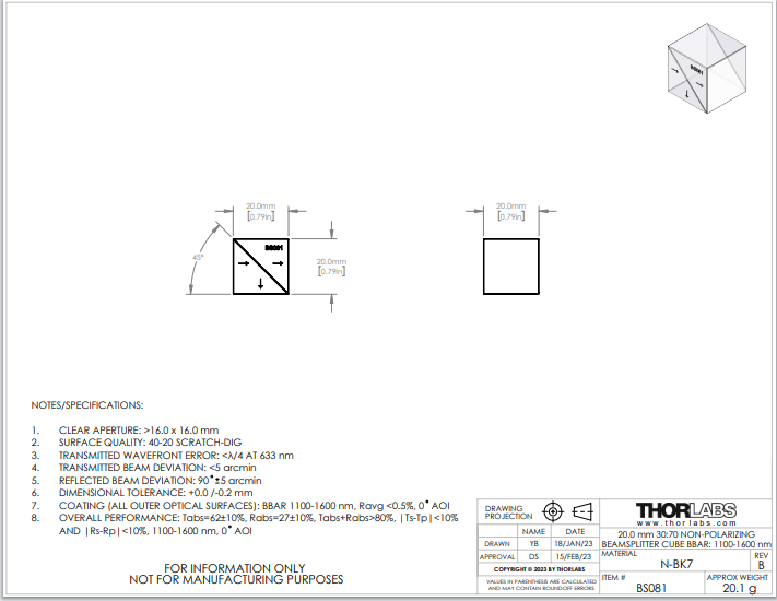 Thorlabs索雷博 BS081 30:70(R:T)非偏振分束立方