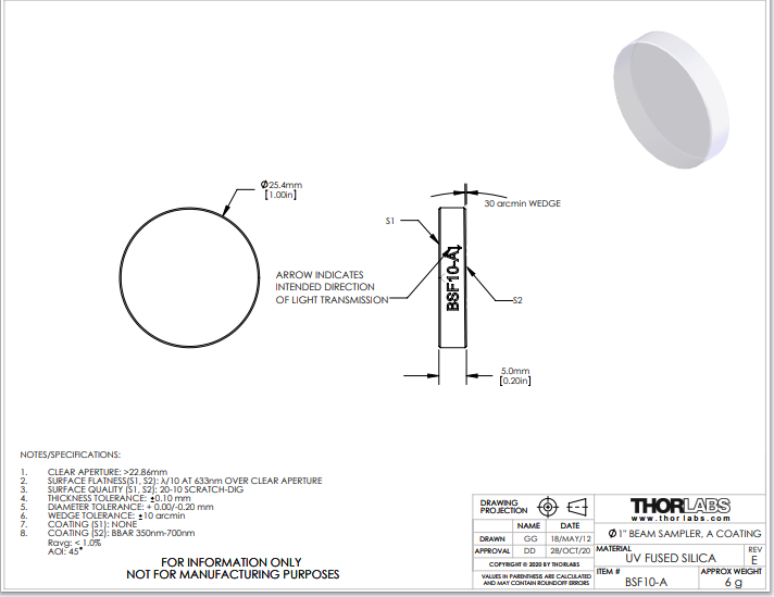 Thorlabs索雷博 BSF10-A 光束采样镜