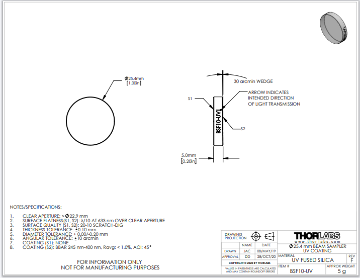 Thorlabs索雷博   BSF10-UV   光束采样镜