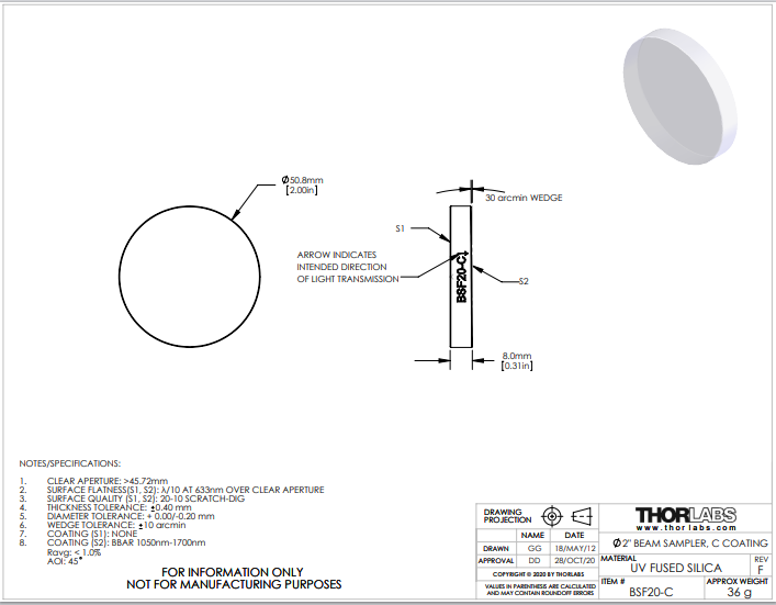 Thorlabs索雷博 BSF20-C 光束采样镜