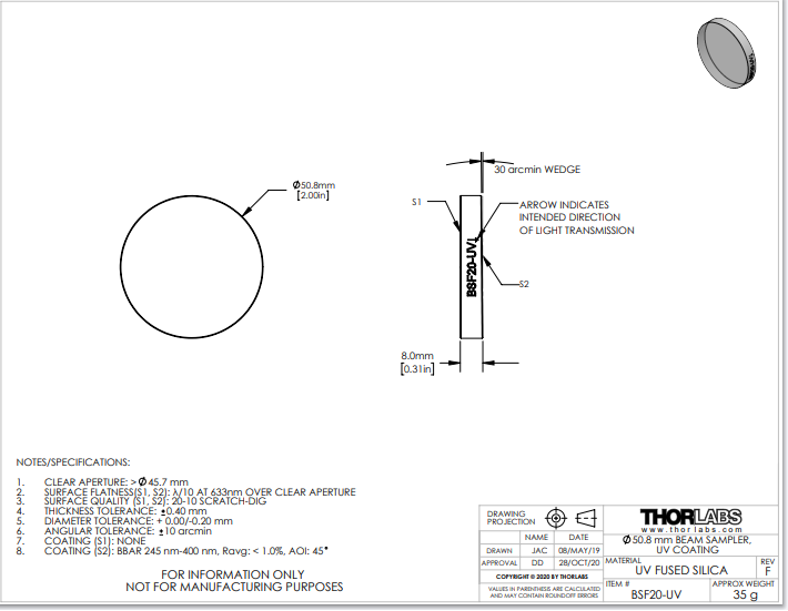Thorlabs索雷博 BSF20-UV 光束采样镜
