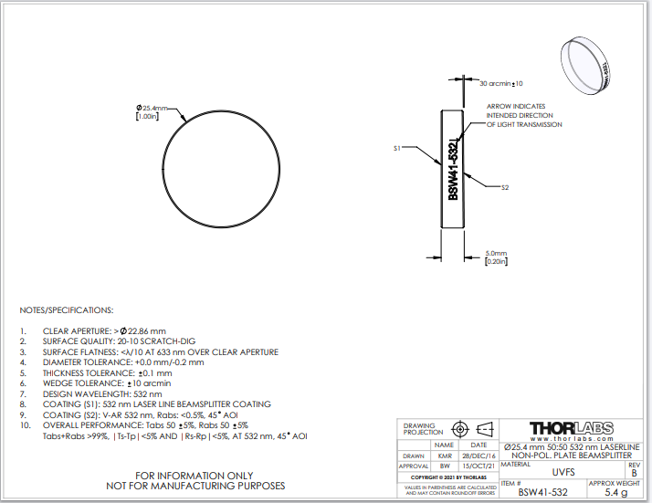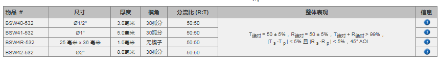 Thorlabs索雷博 BSW41-532 50:50激光谱线平板分束镜