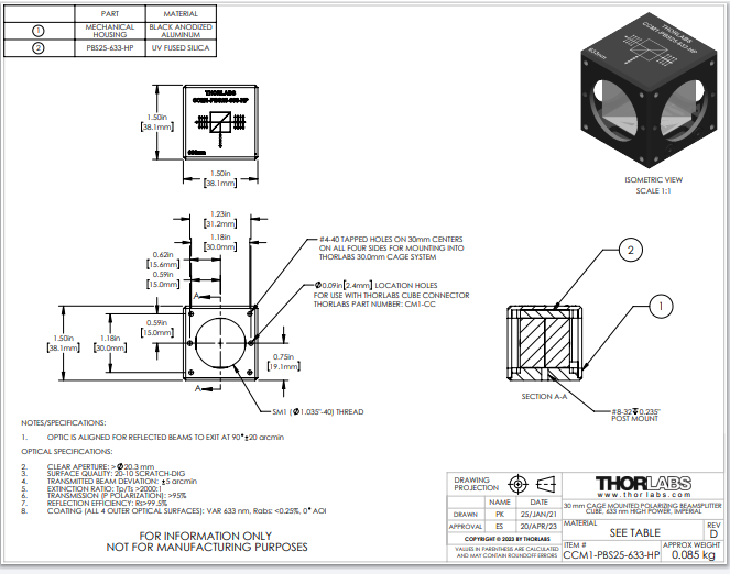 Thorlabs索雷博 CCM1-PBS25-633-HP - 高功率偏振分束立方