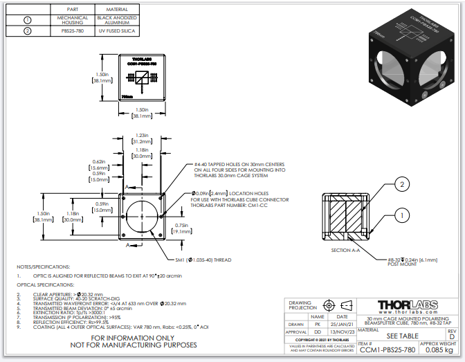Thorlabs索雷博 CCM1-PBS25-780 - 偏振分束立方