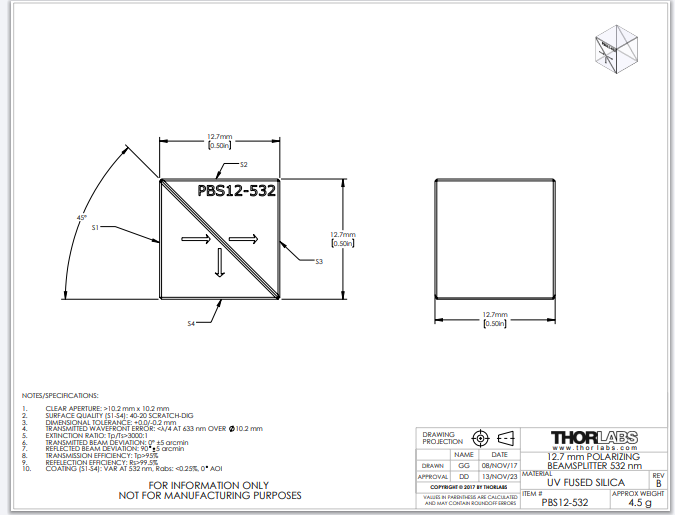 Thorlabs索雷博 PBS12-532 - 偏振分束立方