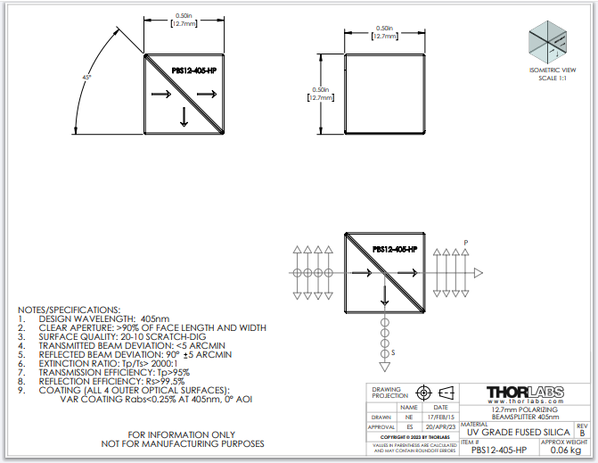 Thorlabs索雷博 PBS12-405-HP - 1/2英寸高功率偏振分束立方