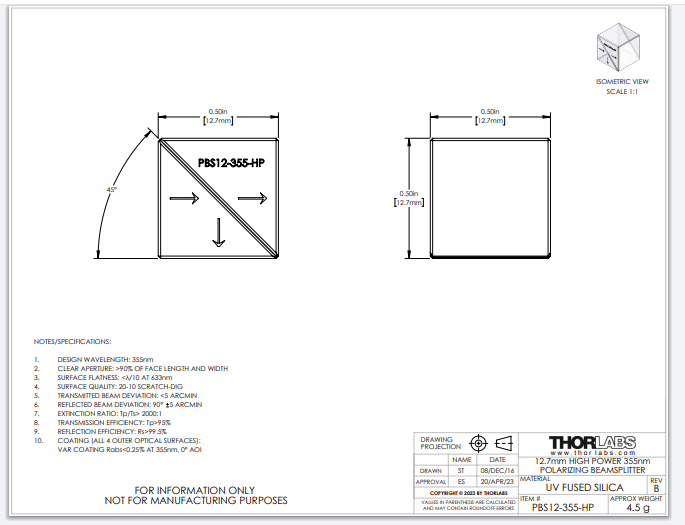Thorlabs索雷博 PBS12-355-HP - 1/2英寸高功率偏振分束立方