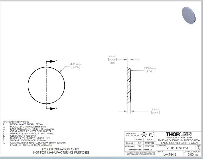 Thorlabs索雷博 LA4184-B 平凸透镜