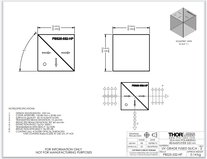 Thorlabs索雷博 PBS25-532-HP - 1英寸高功率偏振分束立方