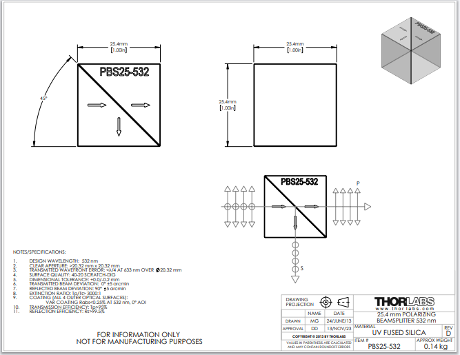 Thorlabs索雷博 PBS25-532 - 偏振分束镜立方