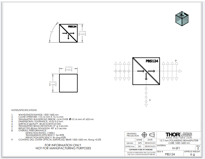 Thorlabs索雷博 PBS124 - 1/2英寸偏振分束立方体