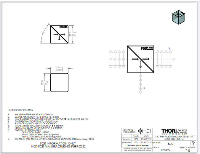 Thorlabs索雷博 PBS122 - 1/2英寸偏振分束立方体