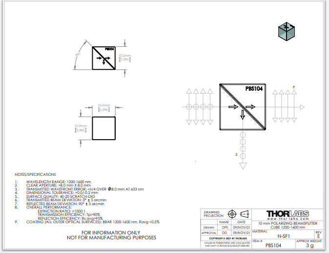 Thorlabs索雷博 PBS104 - 10 mm偏振分束立方体