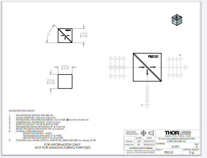 Thorlabs索雷博 PBS101 - 10 mm偏振分束立方体