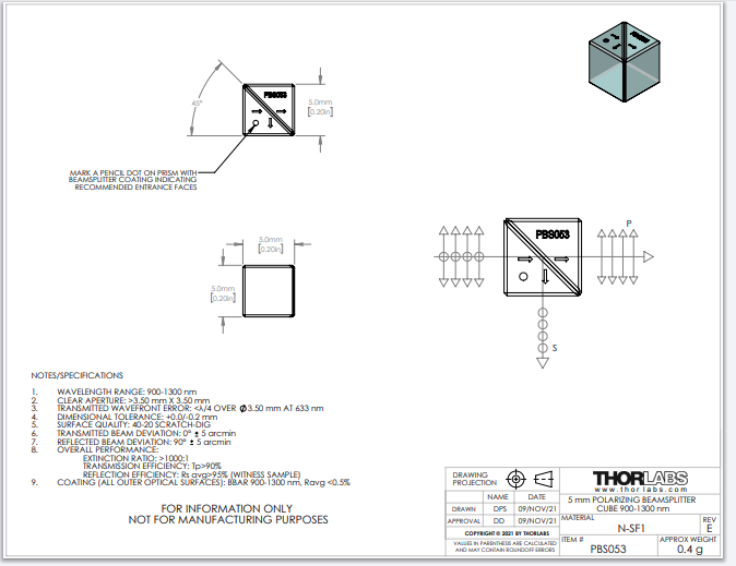 Thorlabs索雷博 PBS053 - 5 mm偏振分束立方体
