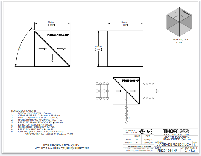 Thorlabs索雷博 PBS25-1064-HP - 1英寸高功率偏振分束立方