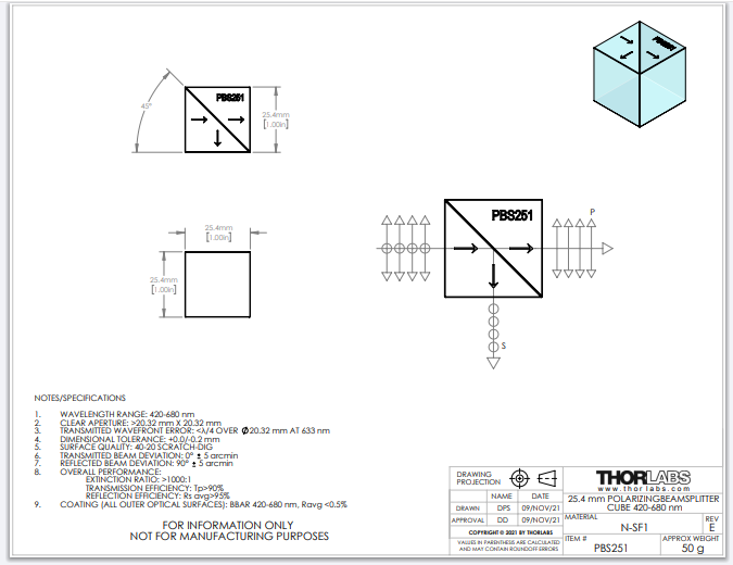 Thorlabs索雷博 PBS251 - 1英寸偏振分束立方体