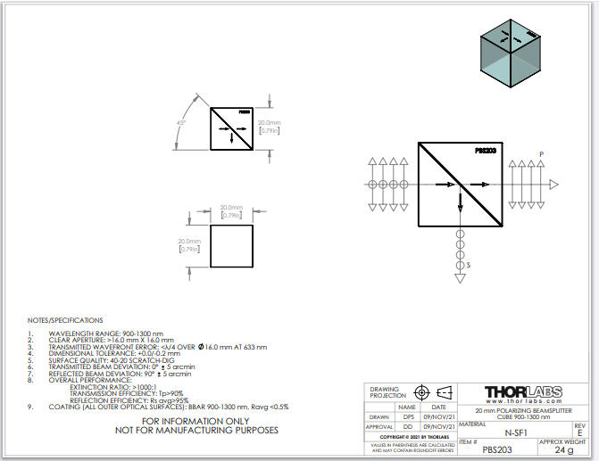 Thorlabs索雷博 PBS203 - 20 mm偏振分束立方体