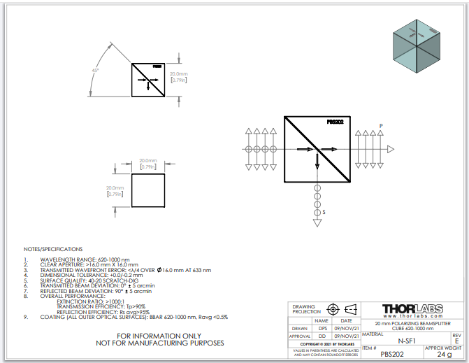 Thorlabs索雷博 PBS202 - 20 mm偏振分束立方体
