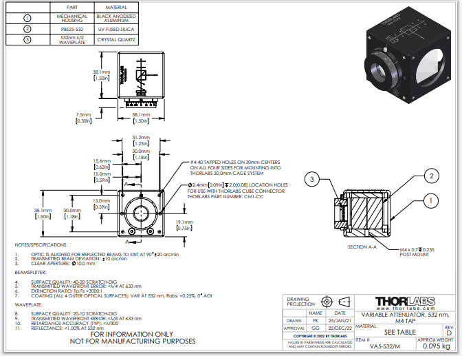 Thorlabs索雷博 VA5-532/M - 可变分束镜